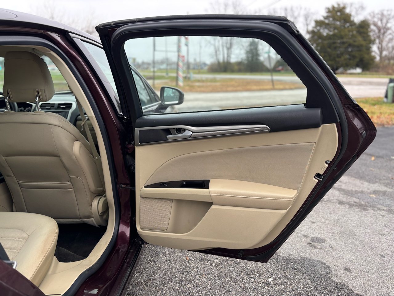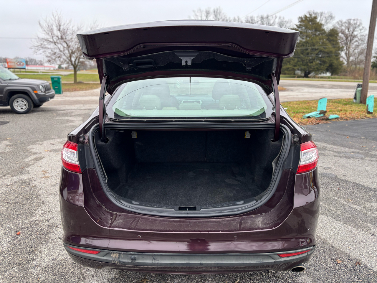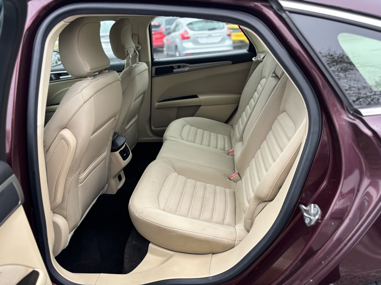 The 2013 Ford Fusion SE in Bordeaux Reserve (a deep, rich burgundy color) is a striking sedan that combines style with practicality. The exterior features sleek, aerodynamic lines that enhance its modern look, while the bold front grille and sharp headlights give it a confident presence on the road. The Bordeaux Reserve paint adds a touch of sophistication, with a glossy finish that catches the light beautifully, accentuating the car's contours.